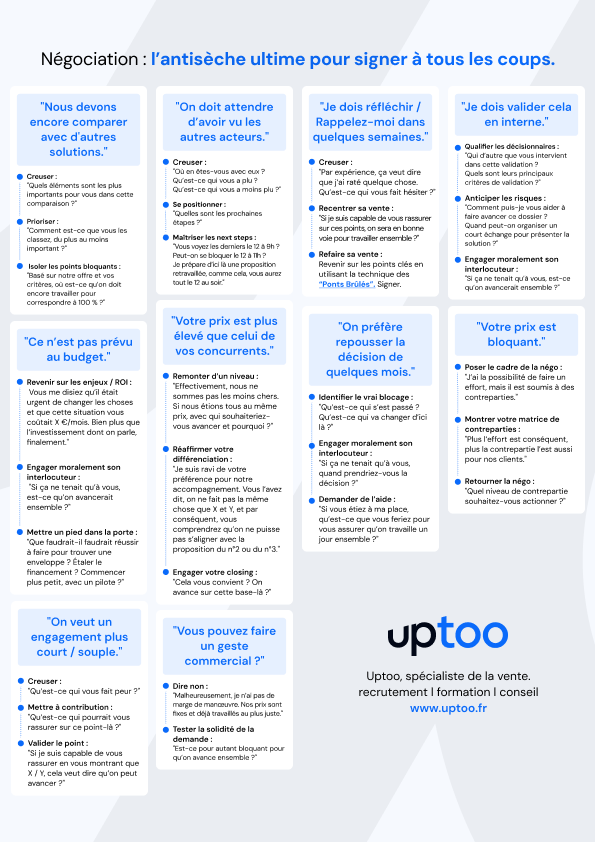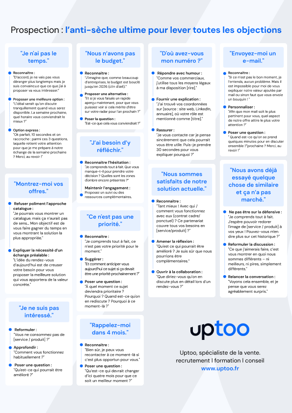 Avec ces deux anti-sèches Uptoo, vous offrez à vos équipes un véritable kit de survie commerciale : 20 objections typiques, issues du terrain, 60 réponses testées et approuvées, prêtes à l’emploi pour ne plus jamais se retrouver à court d’arguments – ni d’options.